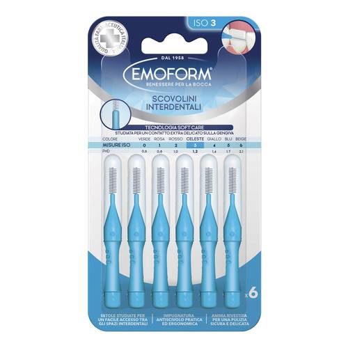 EMOFORM SCOVOLINI INTERDENTALICELESTE Descrizione Scovolino dotato di setole studiate appositamente per arrivare su tutti gli spazi interdentali, con tecnologia Soft Care per un contatto delicato su gengiva e dente. Morbido e pratico tra le dita, per un utilizzo semplice e comodo grazie alla sua presa ergonomica e all'impugnatura antiscivolo. Con cappuccio igienico, utilizzabile anche per allungare il manico. Modalità d'uso Pulire lo spazio tra i denti almeno una volta al giorno con 3 o 4 movimenti delicati avanti e indietro e senza forzare negli spazi più stretti. Per i denti posteriori inclinare la testina dello scovolino. ...